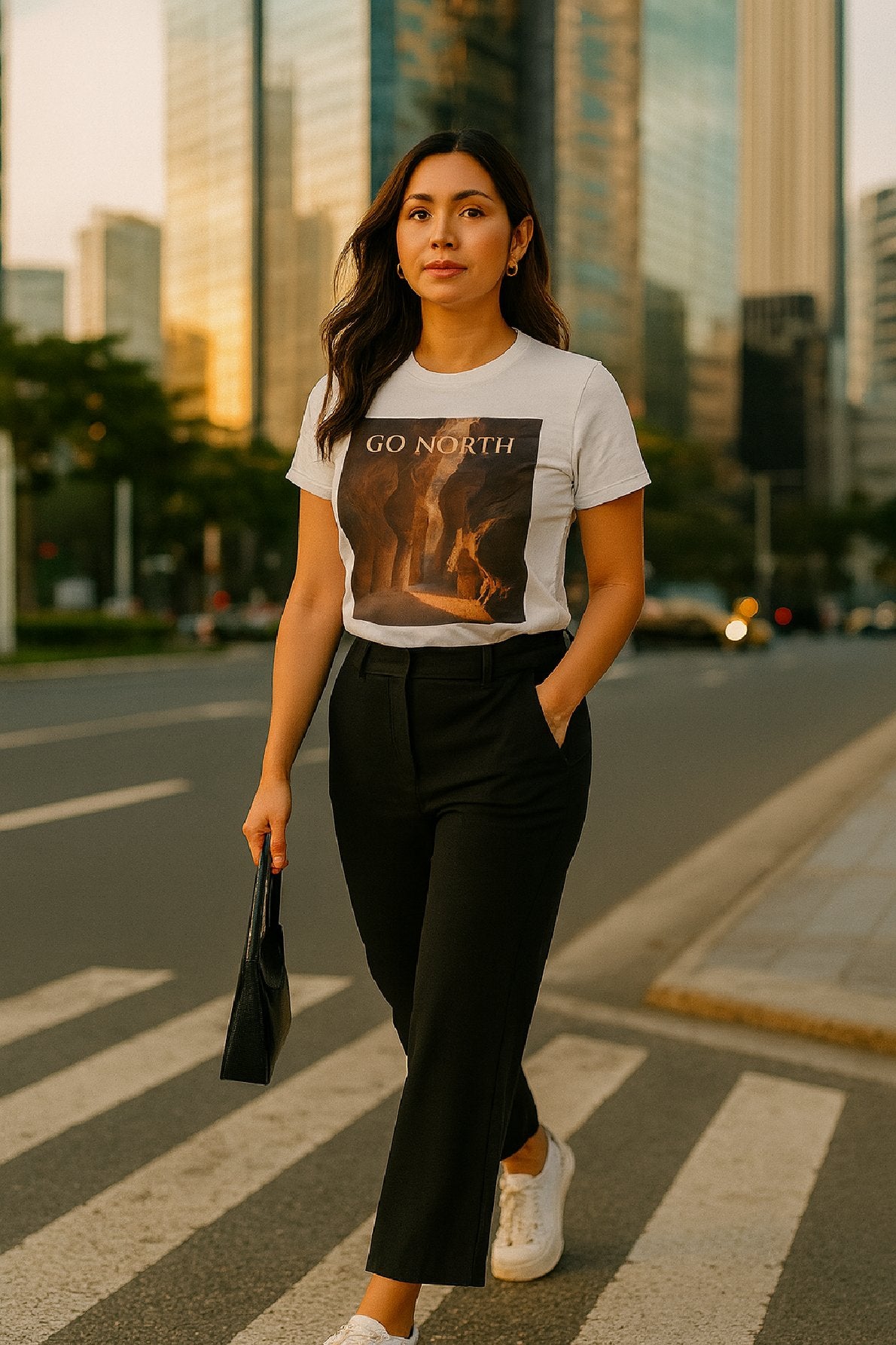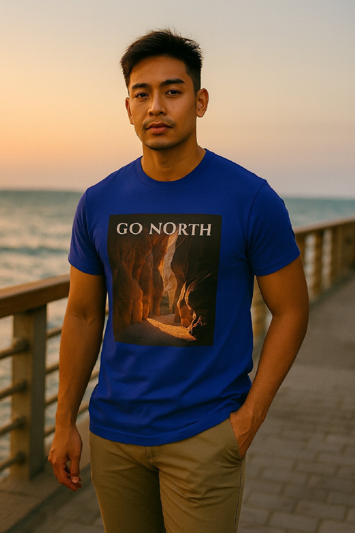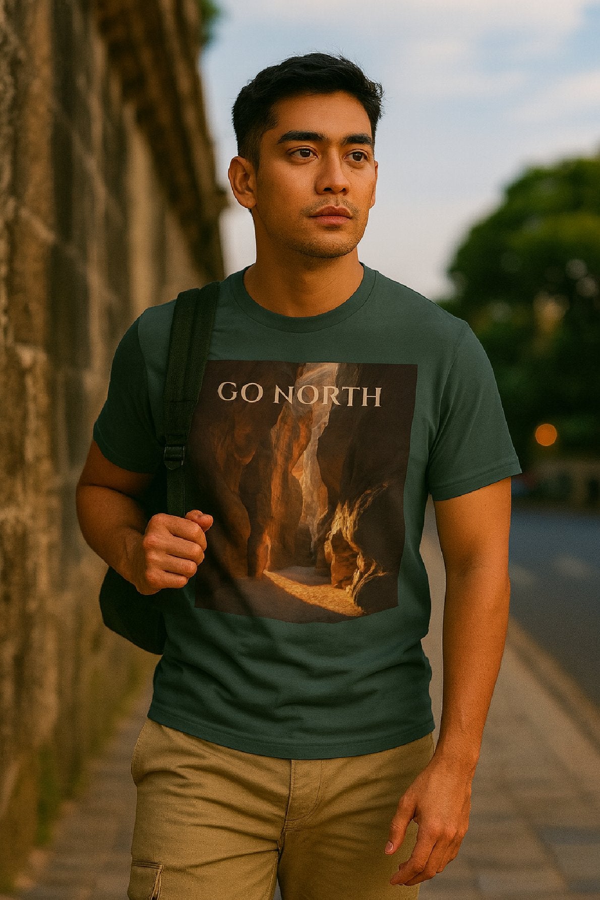 Wear your horizon. Desert Northbound captures the raw glow of a golden canyon at magic hour, where sunlight pierces through sandstone walls and long shadows stretch across the desert floor. Subtle textures suggest the call to “GO NORTH,” making this bold, photoreal wearable art feel as timeless as the landscape itself. Clean, cinematic, and deeply atmospheric, it’s built to stand out while pairing effortlessly with denim, cargos, or technical layers as part of the Northern Horizons flagship collection.