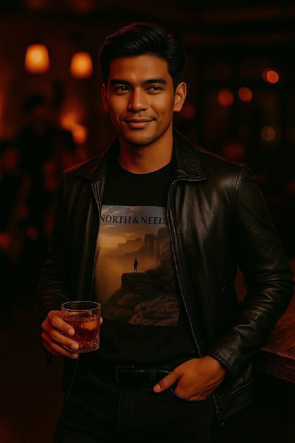 Wear your horizon. Trailblazer captures the awe of standing at the edge of a vast canyon at sunrise—long shadows stretching across endless stone, warm golden light spilling into the depths, and a lone figure framed against the horizon. Rendered in wide-angle cinematic realism, this photoreal wearable art embodies courage, exploration, and perspective. Dramatic yet grounded, it pairs effortlessly with denim, cargos, or technical layers as part of the Northern Horizons flagship collection.